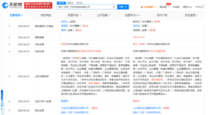 近日有消息称,原万达汽车科技服务有限公司发生工商变更,企业名称从“万达汽车科技服务有限公司”变更为“泰庆(珠海)汽车科技服务有限公司”。
