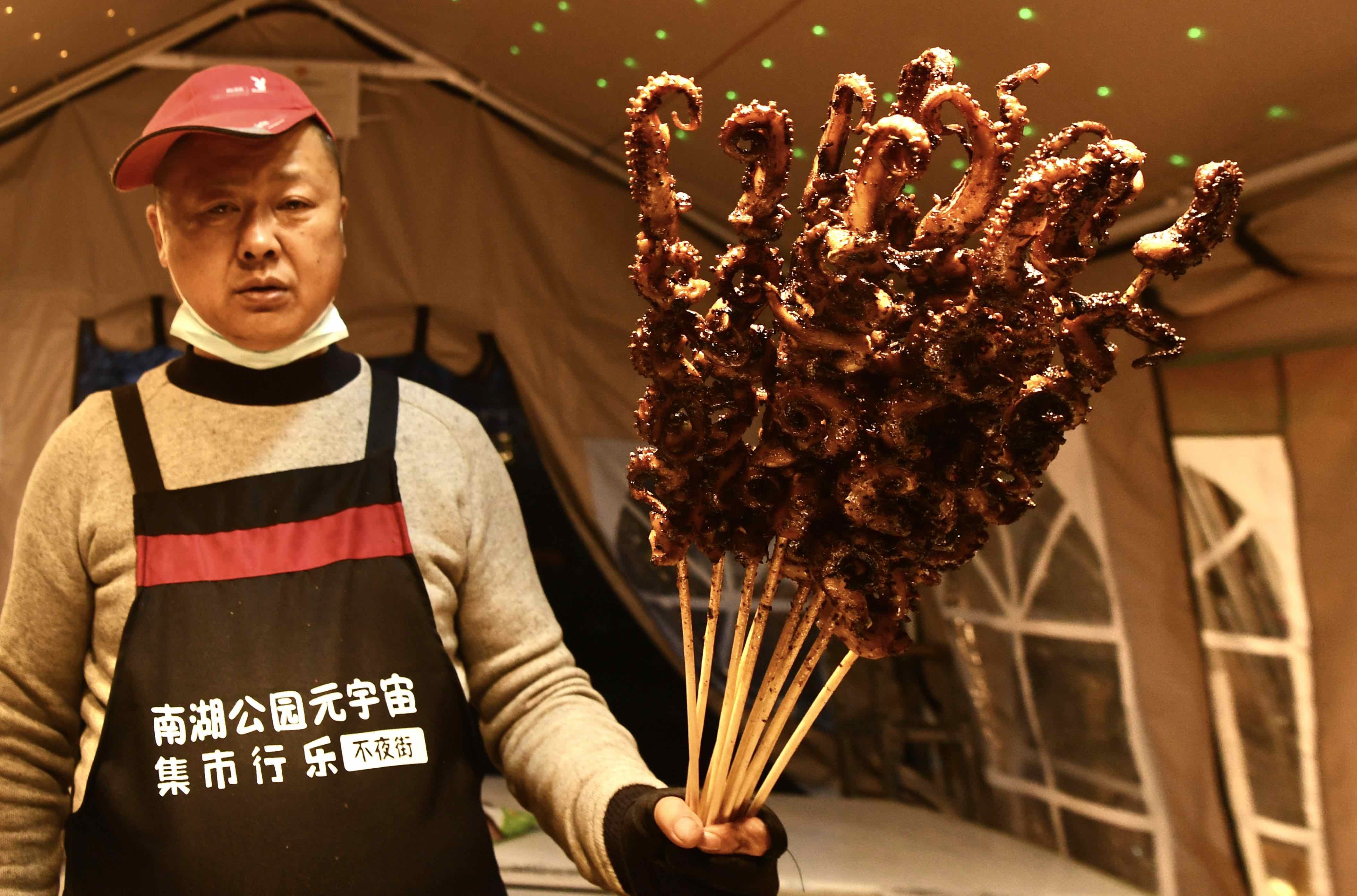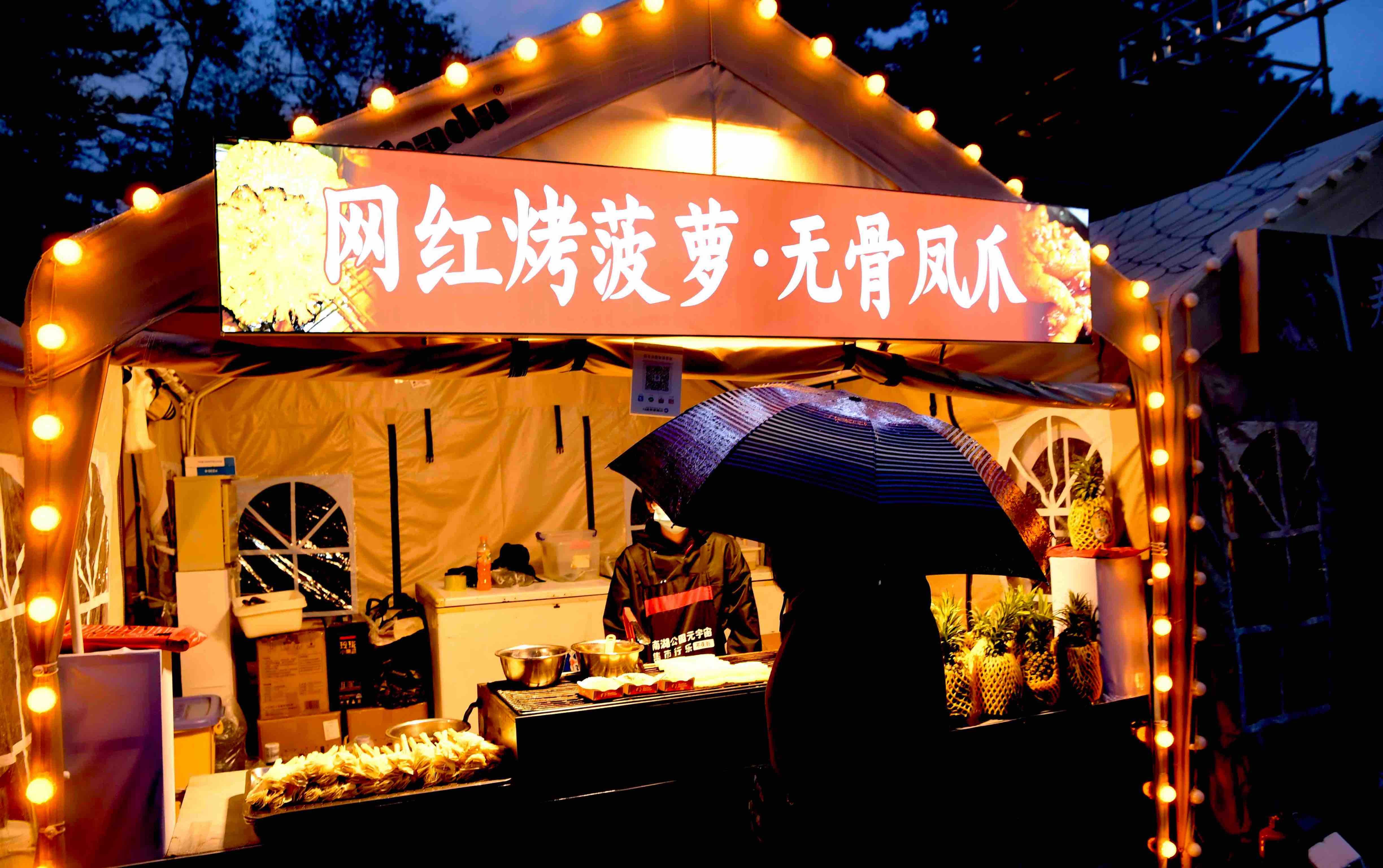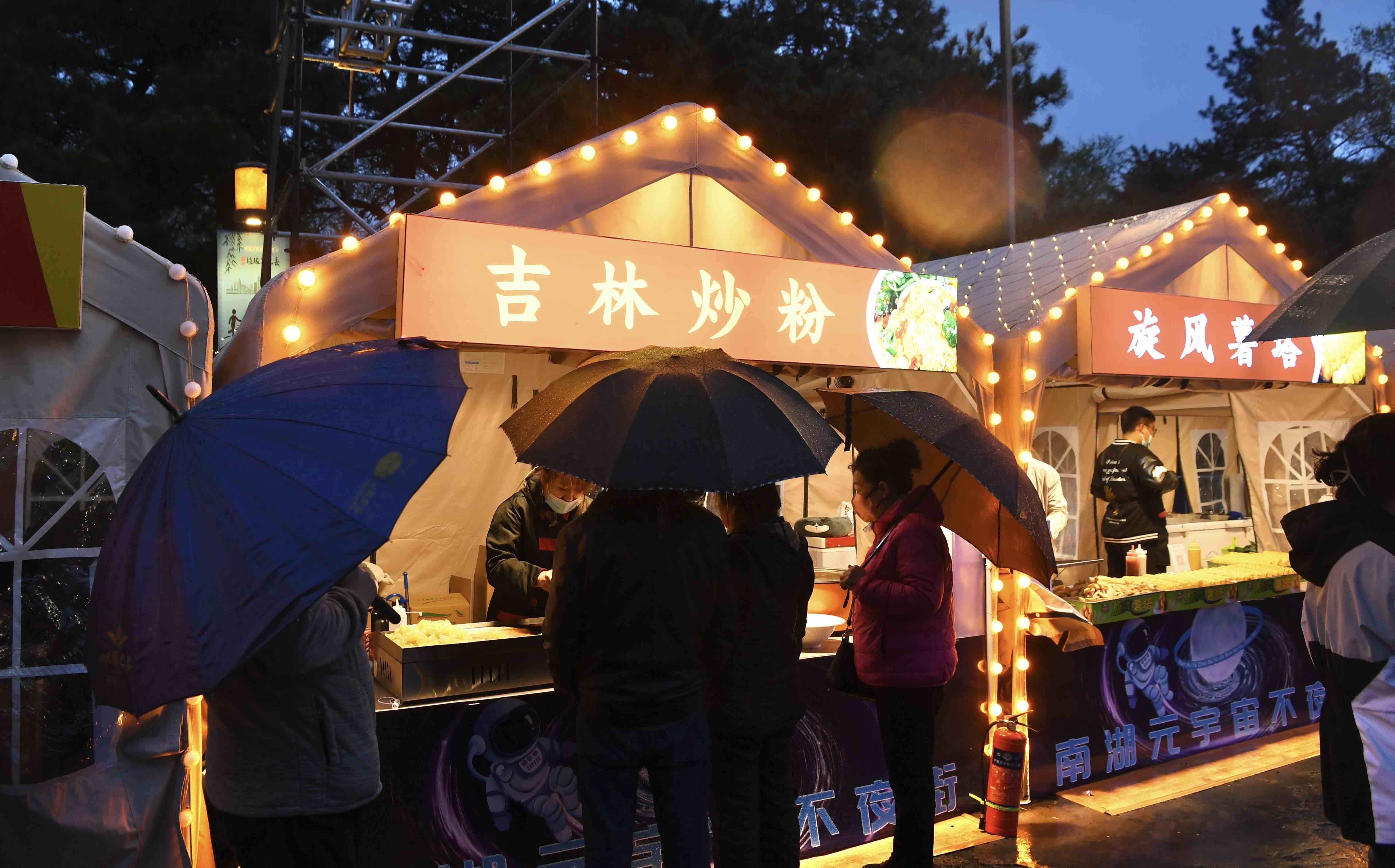 元宇宙不夜街位于南湖公园四号门处,占地面积3000平方米,计划每天营业时间从18时至晚23时。29日下午长春开始降雨,元宇宙不夜街首日的客流不多,不过现场的潮流美食还是吸引了一些市民冒雨品尝。烤鱿鱼、炒粉、烤生蚝、章鱼小丸子、旋风薯塔、钵钵鸡、烤肉串、网红烤菠萝、蛋仔冰淇淋等,香气四溢。游客还能品尝到西双版纳风味的凉拌水果等。全国各地风味的美食汇聚于此,令人垂涎欲滴。