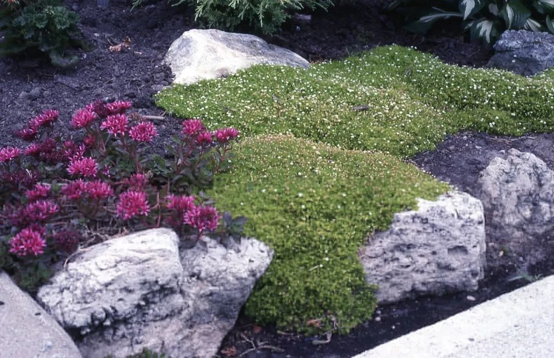 爱尔兰珍珠草看起来像苔藓,但又不是苔藓,这是非常奇特的一种耐阴植物,喜欢生长在阴凉和潮湿的地方,在草坪和石头边缘处都可以栽种,它的叶片是深绿色的,可种在地面上,能够长成一片小地毯。