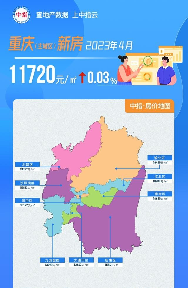 据中指监测,2023年4月重庆主城区新房均价11720元/平米,环比上涨0.03%;二手房均价13545元/平米,环比下跌0.24%。