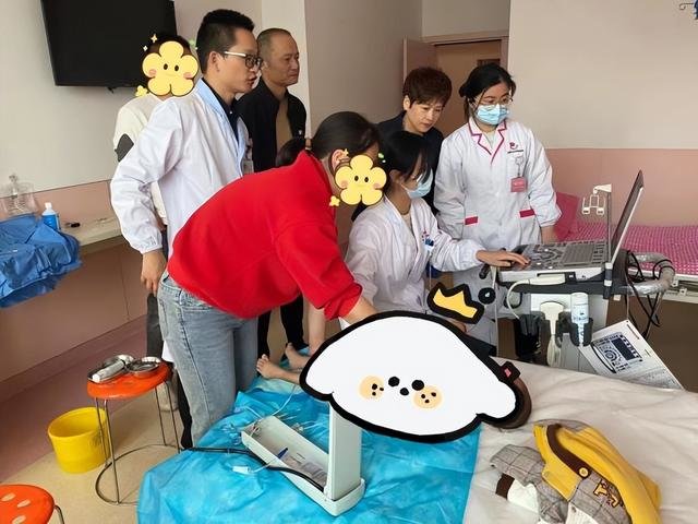 在贺勇副院长的现场指导下、超声科林满菊主任的指点下,曹颖、刘虎、伍筱兰三位年轻的医生将各项工作有条不紊的推进:术前常规检查、加热生理盐水、插管、灌液……