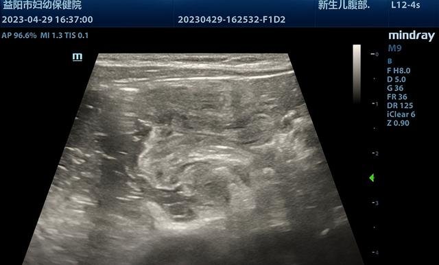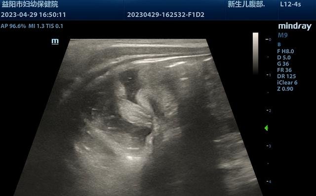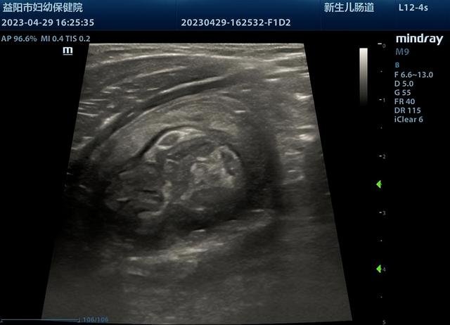 经过益阳市妇幼保健院小儿外科刘虎医生、超声科曹颖医生综合评估后,认为患儿具有温盐水灌肠复位的指征。在与患儿家属充分沟通后,立刻着手准备温盐水等灌肠物品,决定对患儿实施超声监测下温盐水灌肠小儿肠套叠复位术。