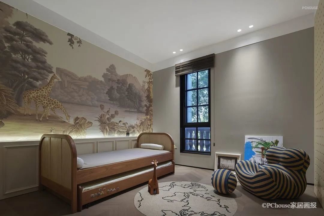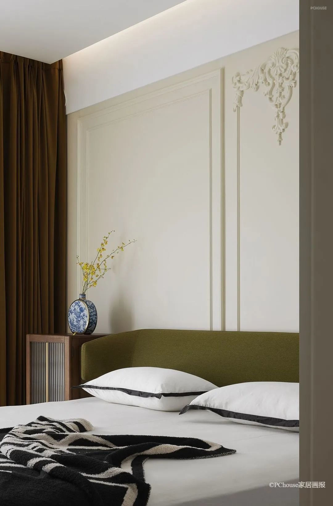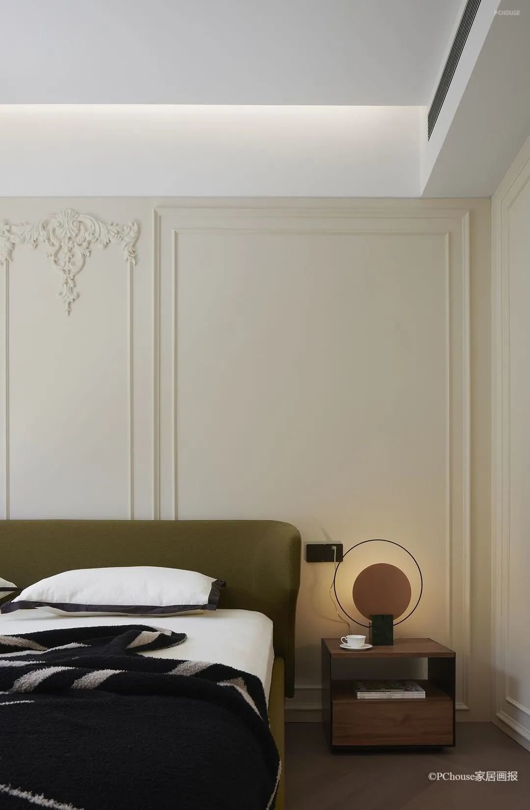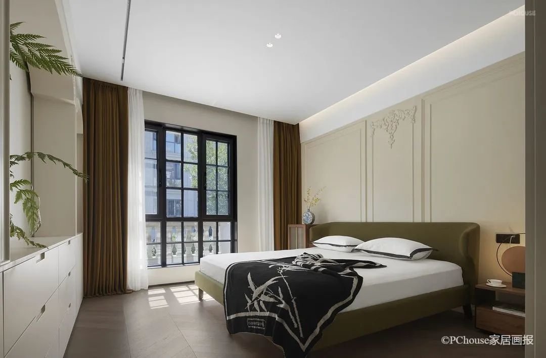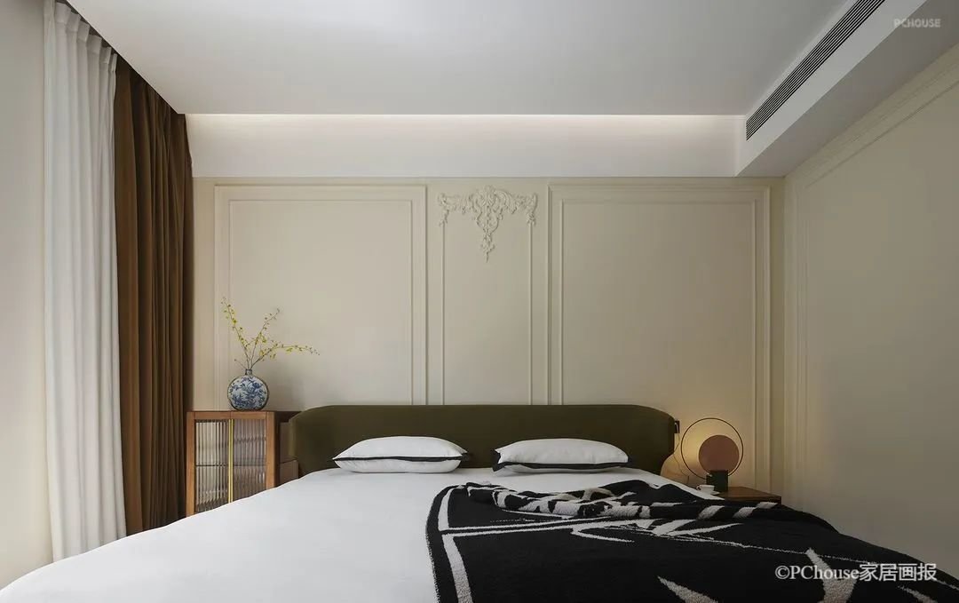 设计没有过多的干预卧室空间,留给了静谧的氛围,却又胜在韵脚。雕花石膏线以细节处的精度,四两拨千斤,升华了整个空间的格调。