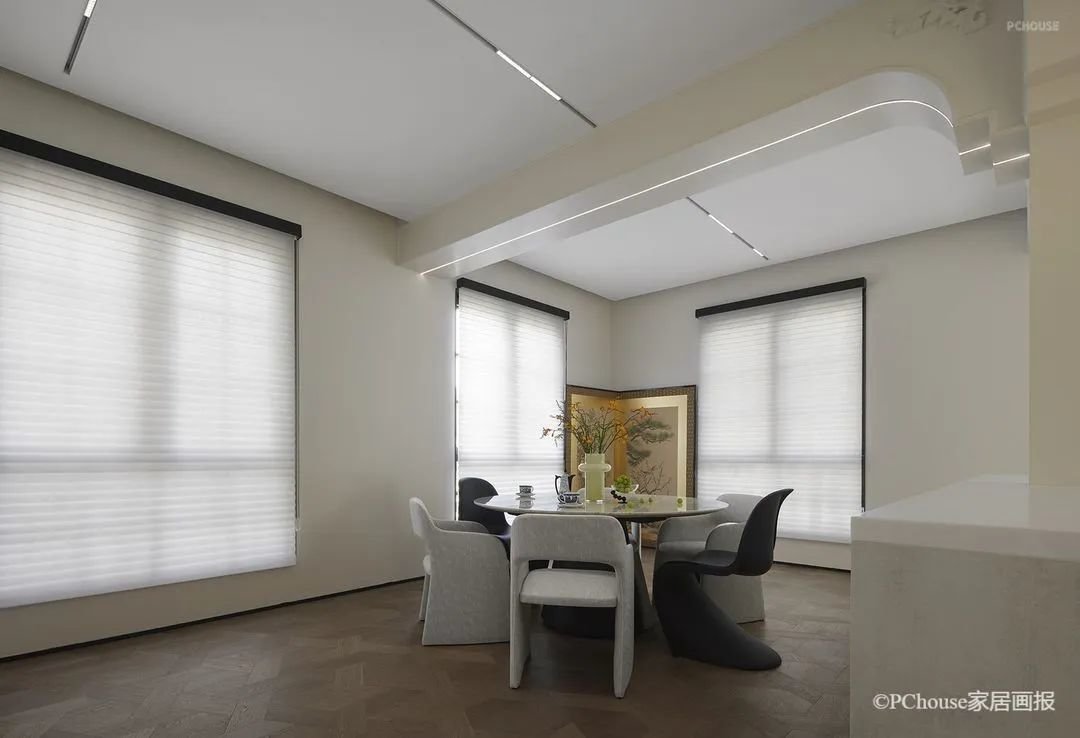 设计师在满足核心的功能之外,大量的留白处理,反向聚焦了家庭的动线焦点,也令家的相处有了更多极具呼吸感的通透,功能与精神皆可自由生长。