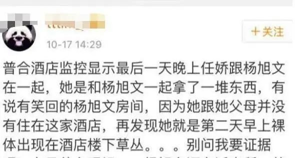 最后,还有人爆料任娇的死因和“迷J”有关,于是杨旭文又被大众列为了“重点怀疑对象”。