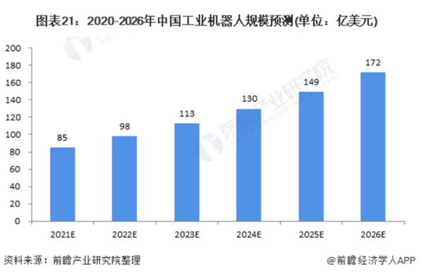 对于工业机器人的规模,前瞻产业研究院预测,2020年全国工业机器人市场规模约为63亿美元,预计2021-2025年复合增长率预计在15%左右,2026年市场规模可达172亿美元。