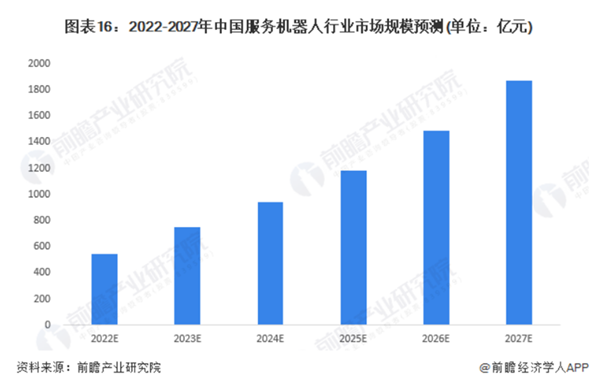随着服务机器人的应用需求增多,服务机器人市场逐渐打开,中国服务机器人即将进入市场启动期。前瞻产业研究院预计,到2023年市场规模将达到751.8亿元,到2027年中国服务机器人市场规模有望达到1872亿元。