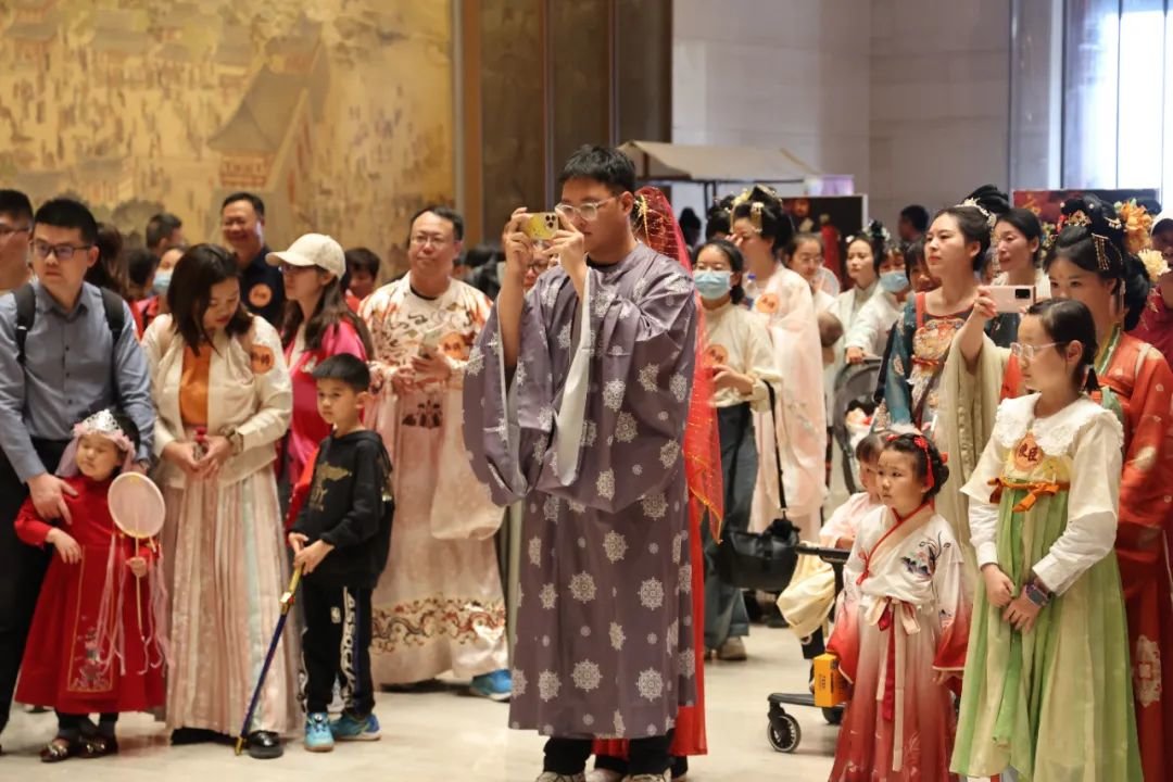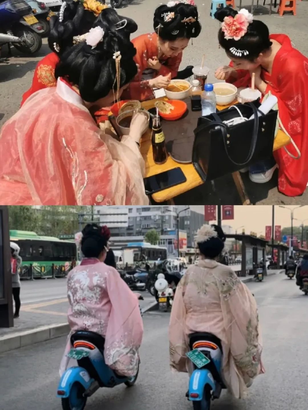 地铁口三三两两汇聚着“贵妃”“大人”,还有广袖飘飘的小电驴队伍……在衣袂翩跹的汉服/异域少女的簇拥下,身着现代服饰的普通游客反而更像是踏错时空的穿越者。