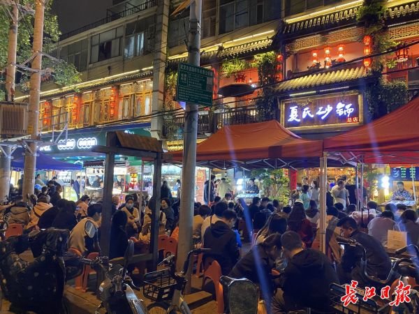 新鲜的小龙虾搭配各式佐料和啤酒,万松园美食街叫号声此起彼伏,雪松路上几乎所有的餐饮店都有“吃货”大排长龙,夏氏砂锅摆出“杜绝黄牛取号”的提示牌,巴厘龙虾取号机显示等候排位已经超千桌。李女士边嘬虾子边感叹:“口感极佳,嗑起来简直停不下来。”