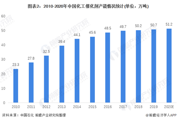 2019年我国化工催化剂产能约为50.7万吨。催化剂作为重化工行业,随着2020年供给侧改革的进一步深化,前瞻初步估算2020年产能增长率和2019年保持不变,产能达到51万吨。