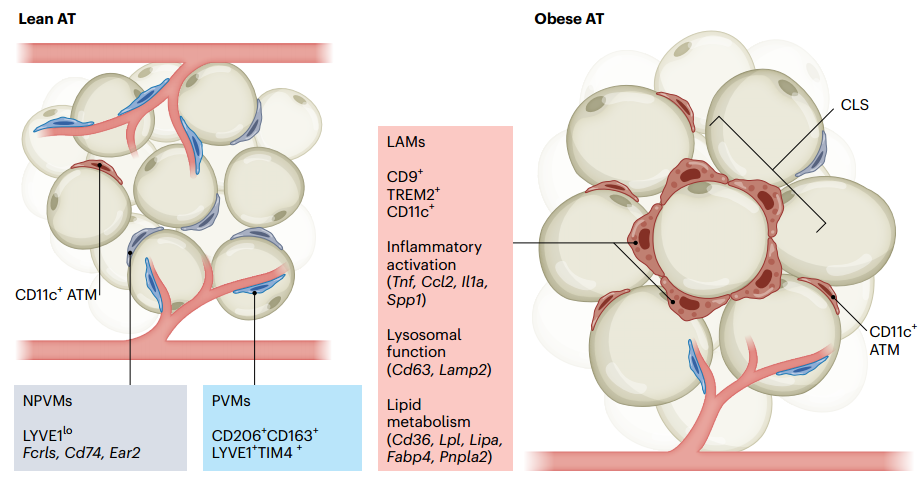 脂肪细胞(AT)中,脂肪相关巨噬细胞(AT-M),在脂肪细胞代谢功能受累的状态下,在脂质稳态中也具有重要的适应功能。AT代谢损害的不良后果可能是未能维持局部脂质平衡,并对AT以外的免疫细胞产生长期影响。