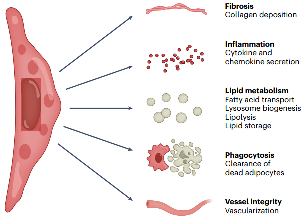 血管周围间充质基质细胞和内皮细胞也在肥胖状态下的AT中表达更多的炎性特征,并可能有助于巨噬细胞的募集。