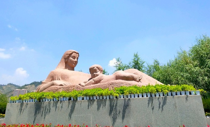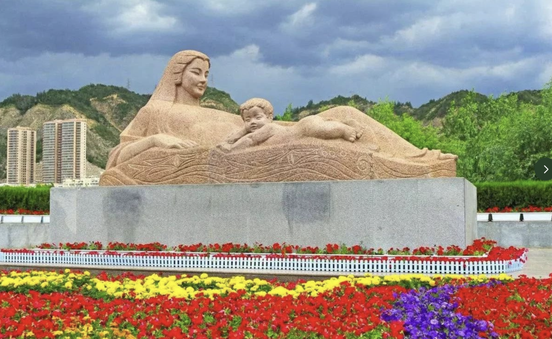 雕像整体呈现了一位神态娴雅的母亲侧卧黄河岸边,看护着怀抱中游泳的幼儿的情景,象征着黄河作为中华民族孕育者的母亲形象,雕塑下基座上刻有水波纹和鱼纹图案,源自甘肃古老彩陶的原始图案也象征着中华民族源远流长、气度大方、不断创造文明的时代精神。