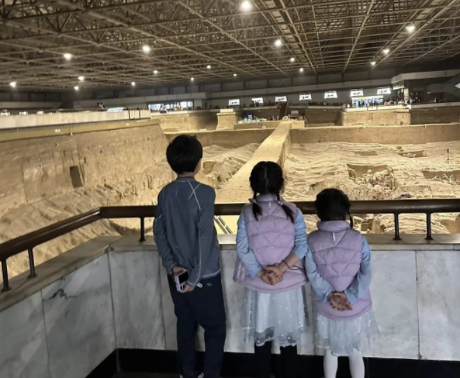 兄妹三人观看秦始皇兵马俑时,都被眼前的壮观景象震撼住了。