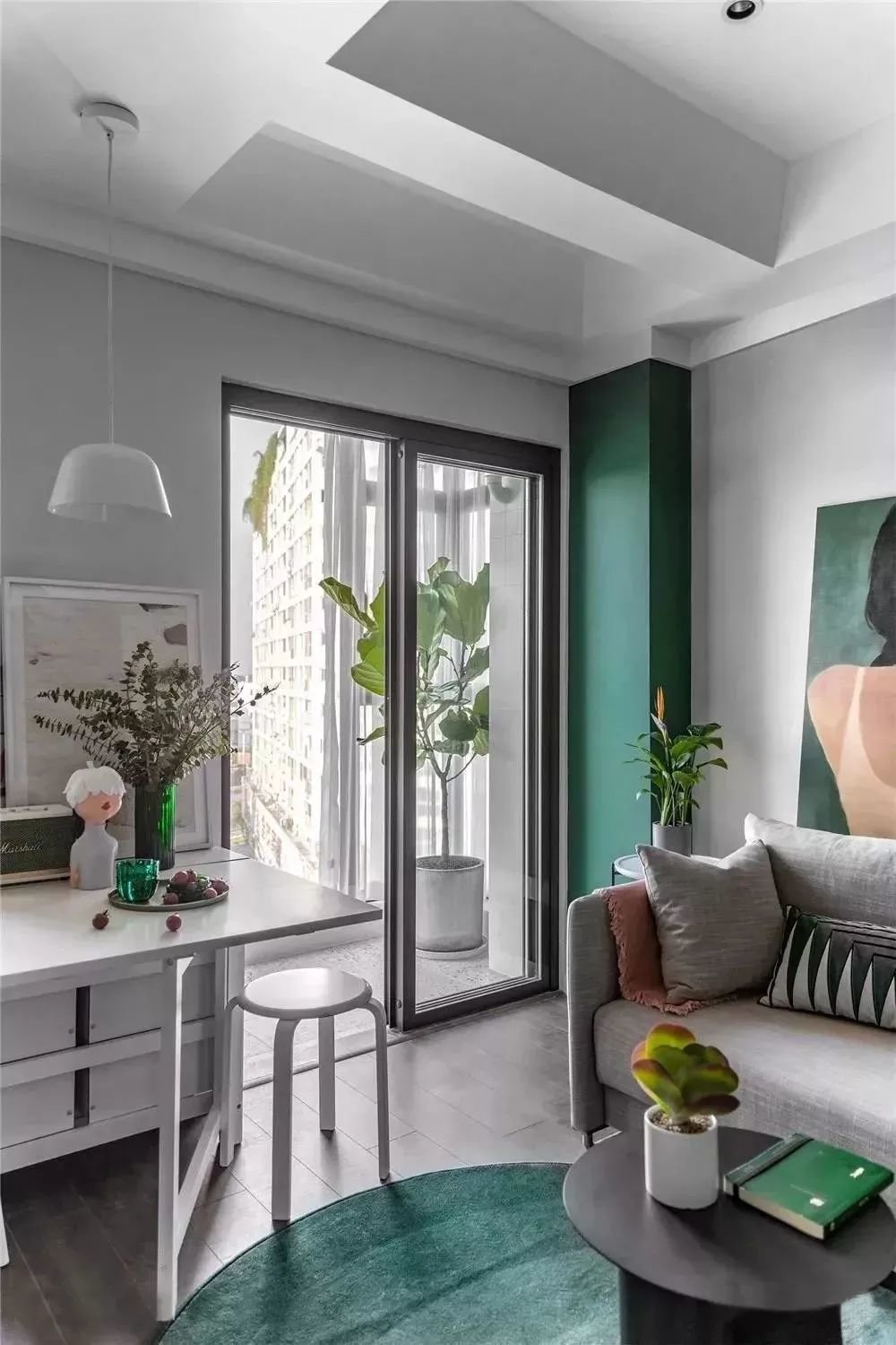 绿色在灰色空间中可以营造出一种经典而不廉价的复古感,平和的特性使绿色在室内能产生安定抚慰的效果。