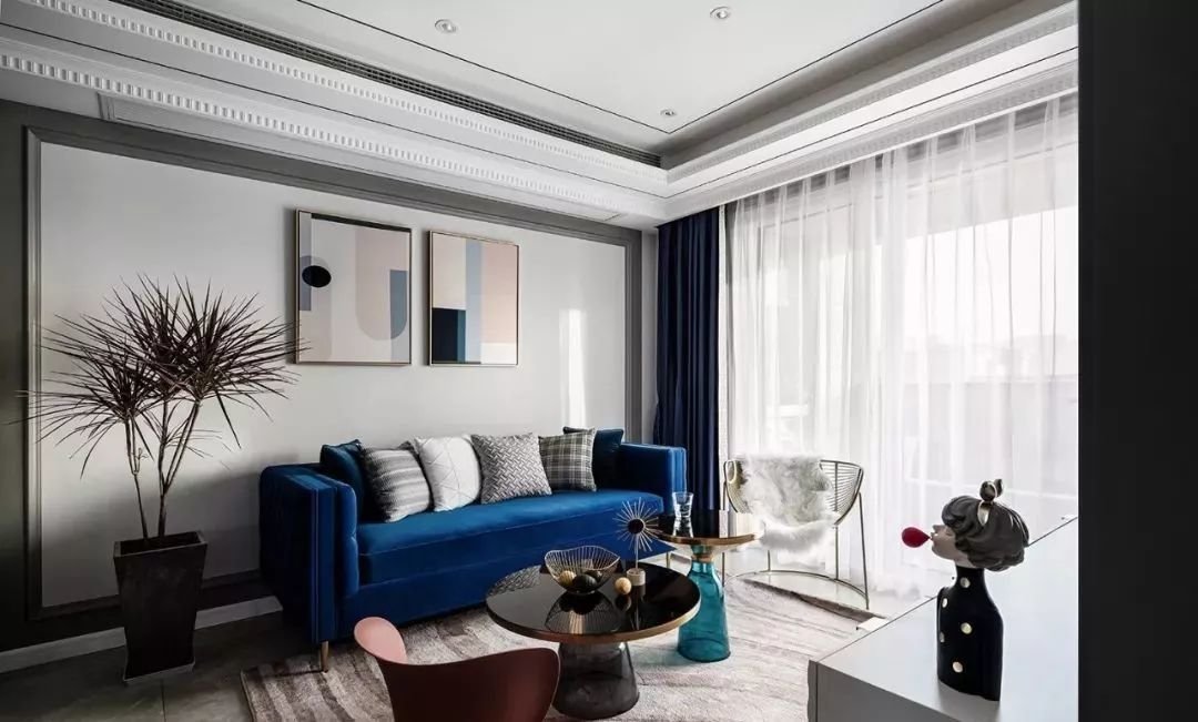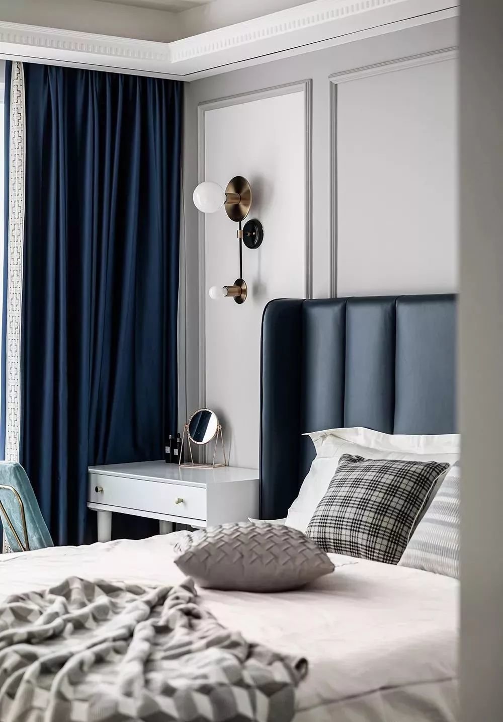 以高级灰为主的空间,藏蓝作为点缀色为空间带来强烈的视觉冲击,让空间显得更加高贵,但要注意的是,藏蓝显色性高,应减少其它颜色的加入,避免视觉混乱。