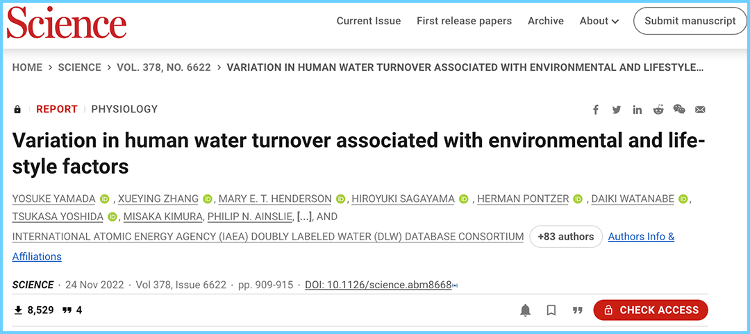 3、Yamada Y, Zhang X, Henderson MET, et al. Variation in human water turnover associated with environmental and lifestyle factors. Science. 2022;378(6622):909-915. doi:10.1126/science.abm8668