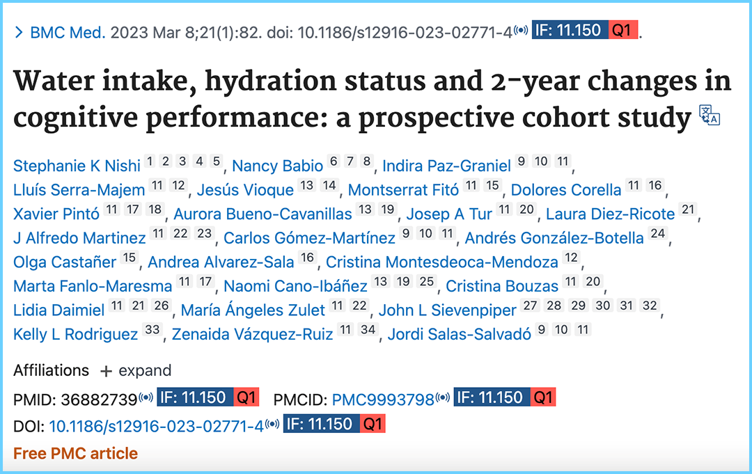 1、Nishi SK, Babio N, Paz-Graniel I, et al. Water intake, hydration status and 2-year changes in cognitive performance: a prospective cohort study. BMC Med. 2023;21(1):82. Published 2023 Mar 8. doi:10.1186/s12916-023-02771-4