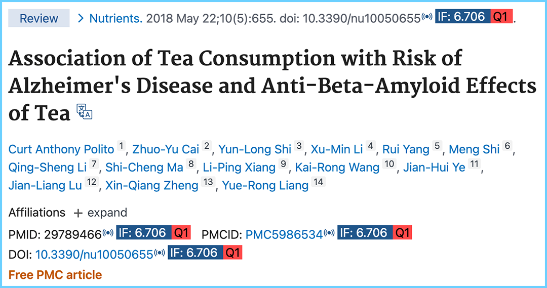 4、Polito CA, Cai ZY, Shi YL, et al. Association of Tea Consumption with Risk of Alzheimer's Disease and Anti-Beta-Amyloid Effects of Tea. Nutrients. 2018;10(5):655. Published 2018 May 22. doi:10.3390/nu10050655