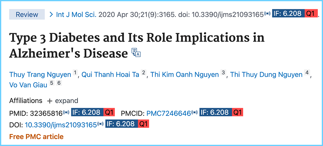 2、Nguyen TT, Ta QTH, Nguyen TKO, Nguyen TTD, Giau VV. Type 3 Diabetes and Its Role Implications in Alzheimer's Disease. Int J Mol Sci. 2020;21(9):3165. Published 2020 Apr 30. doi:10.3390/ijms21093165