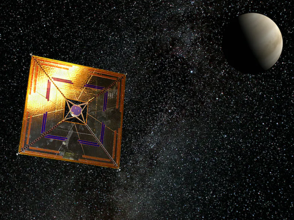 太阳帆,在艺术家概念图里的日本伊卡鲁斯号飞船能到光束的十分之一。