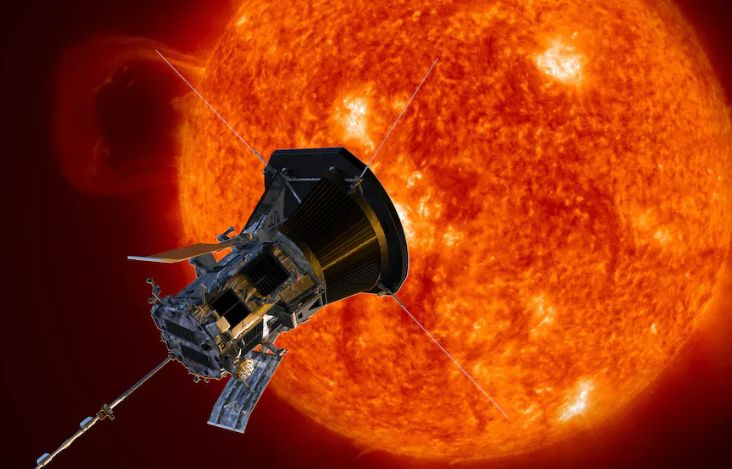 帕克太阳探测器,在艺术家的概念图里,是人类最快的飞行器,靠太阳重力生存合0。05%的光速。(NASA约翰霍普金斯大学史蒂夫高丽本)