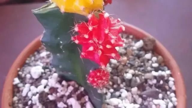 这就要提到,仙人掌科里面的绯牡丹,它球体的颜色是彩色的,有常见的红色、橙色、粉色和紫红色的,它在整个球体上,并没有穿绿色,也就是说它本身没有叶绿素,无法进行光合作用,也就是说它连自然生长的基本能力都已经失去了,只能通过嫁接的方法才能维持存活,一般是将绯牡丹嫁接在一些其他的仙人掌上,来给它提供养分,才能维持正常的生长。