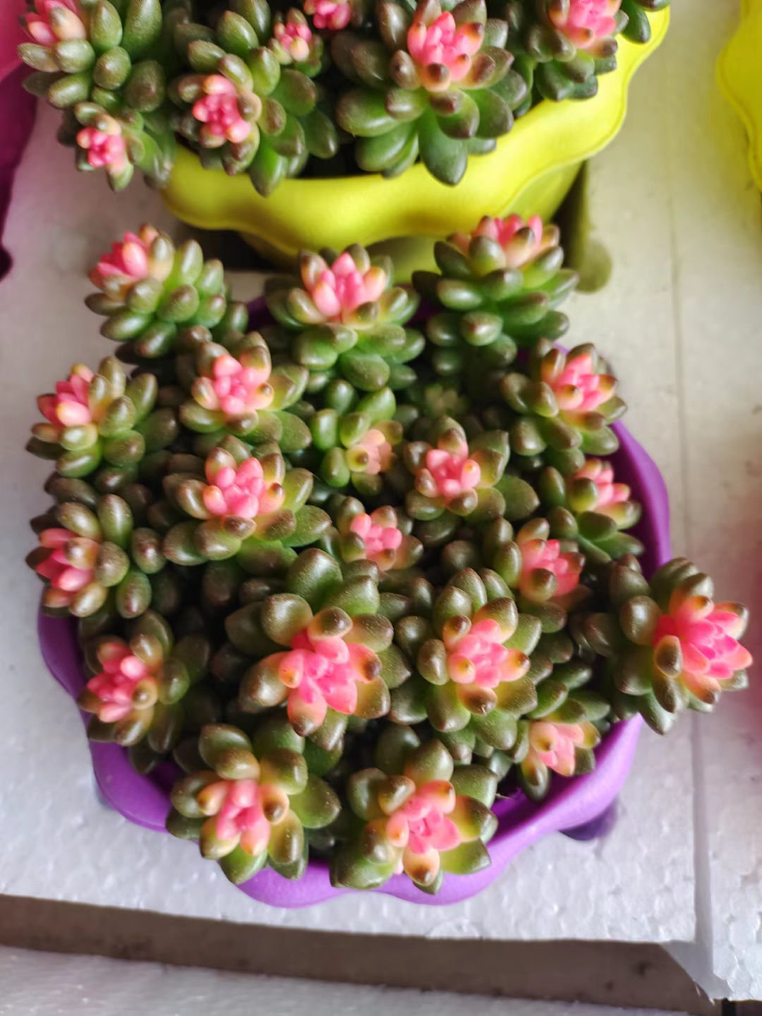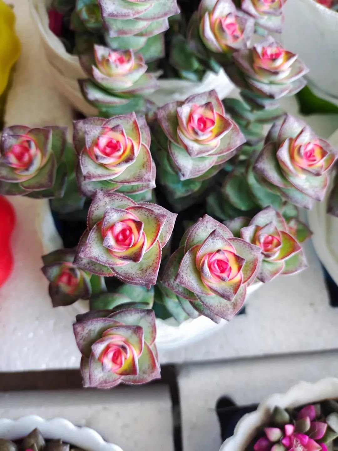 多肉植物也是分自然锦化的和“药锦多肉”,特别是去逛花市的时候,有几种多肉经常被弄成“药锦多肉”,包括常见的紫珍珠、黑王子和金枝玉叶等。