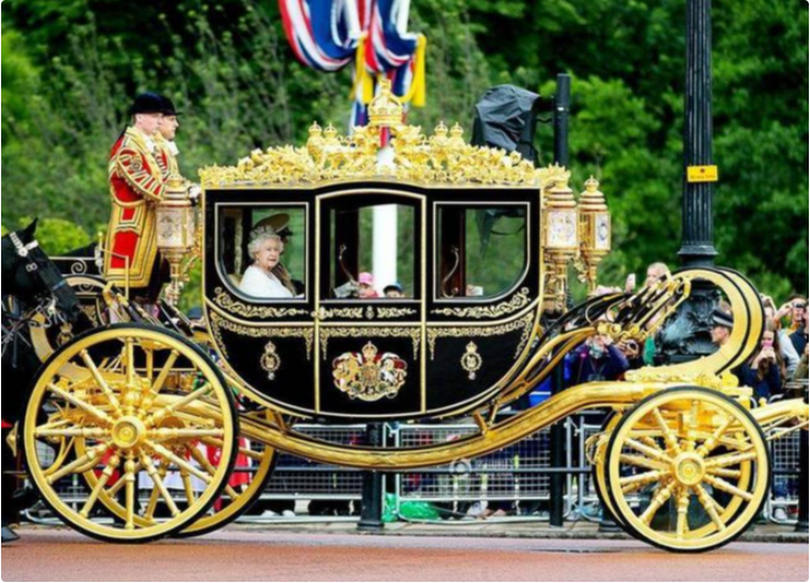 金色马车,于1762年打造,重达4吨,当时的造价高达8000英镑,是一辆木制的镀金马车,车身上描绘的罗马诸神。车顶上有3个小天使,分别象征英格兰、苏格兰和爱尔兰。整车需要八匹马才能缓缓拉动,由于乘坐的感受很差,维多利亚女王抱怨其“痛苦的震荡”,伊丽莎白二世女王称其“就像在皮革上不断弹跳”,差评太多,“令人痛苦”。