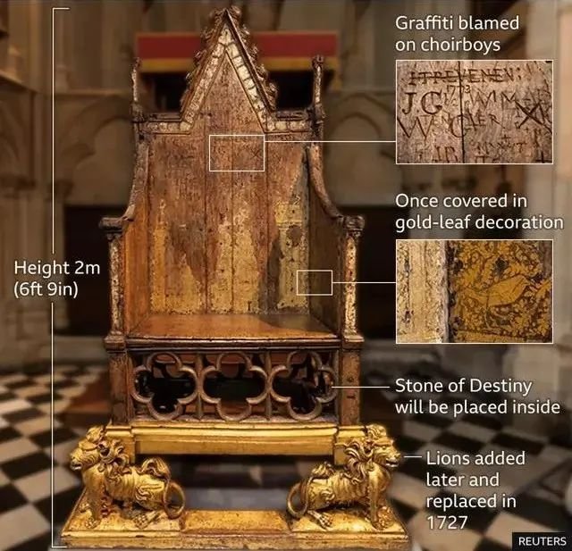 这把加冕椅是镀金橡木的,平日有专家们保护,以保证它在加冕仪式上的状态完好。它是由13世纪英国国王爱德华一世下令打造的。之后,历代英国国王、王后,都是坐在这把椅子上接受加冕的。