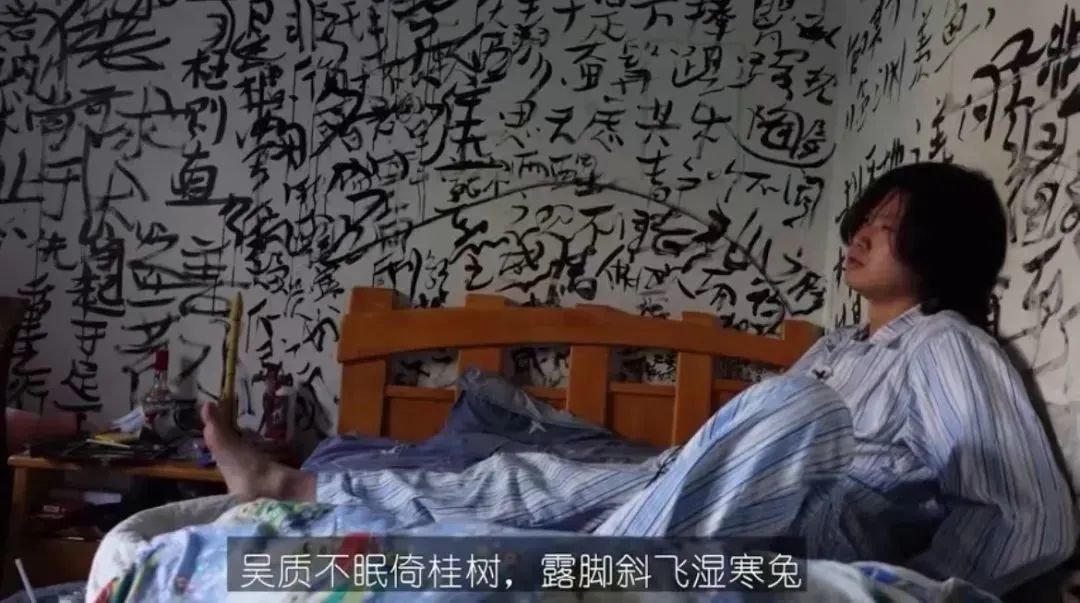 而在他卧室的墙壁上,写满了他喝醉后创作的狂草诗词。