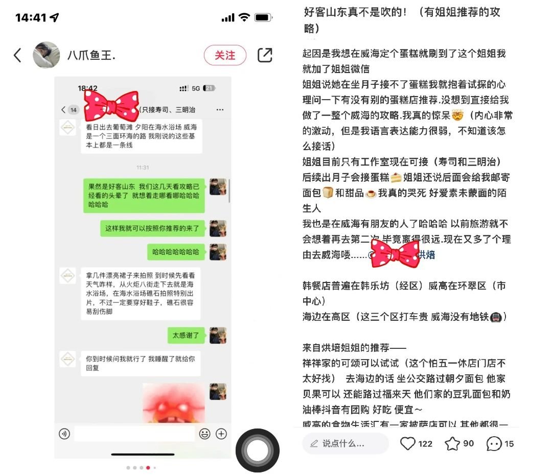 “我是因为朋友正好'五一'过生日,就想在威海订个蛋糕,不过做蛋糕的姐姐有事暂时不能做,但却特别热情地给我们推荐了好多吃的玩的。”这名网友笑称自己是订蛋糕“附赠”了一份旅游攻略。她说,就是随口一提,没想到对方就从“衣食住行”四个方面都给出了建议,威海人真是太热情了。