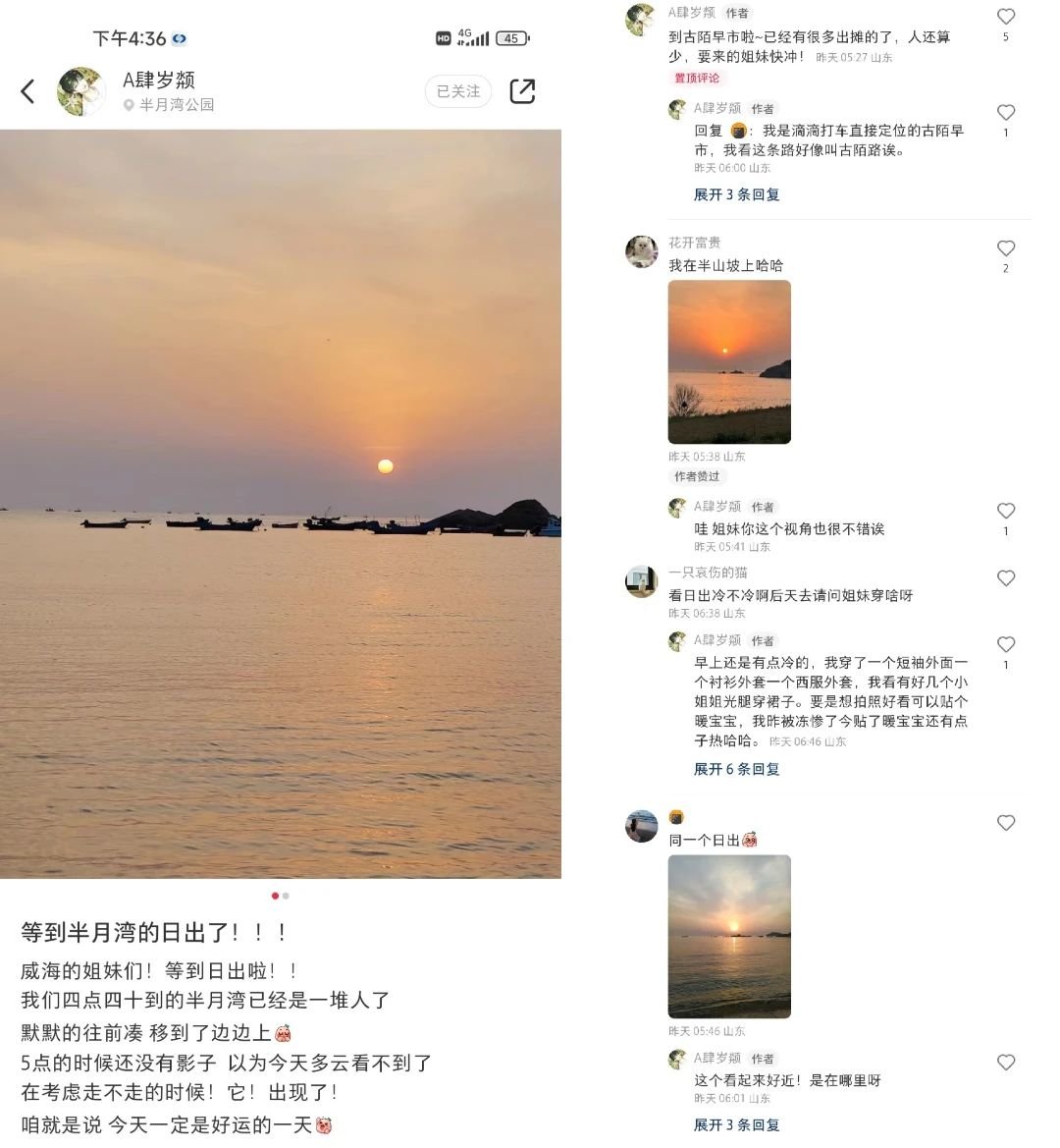 不仅看日落的体验是完美的,“A肆岁颒”在半月湾拍的日出也收获了众多网友点赞,大家纷纷在评论区留言:“穿多厚的衣服去看日出合适”“看完日出可以去哪吃饭”……“A肆岁颒”耐心一一回复。“希望更多人看到威海的美景,感受威海人的热情,威海值得推荐。”“A肆岁颒”说。