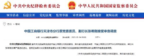 另外,同在5月4日上午,中央纪委国家监委网站通报显示,中国工商银行天津市分行原党委委员、副行长张希刚涉嫌严重违纪违法,接受中央纪委国家监委驻中国工商银行纪检监察组纪律审查和湖北省黄冈市监委监察调查。