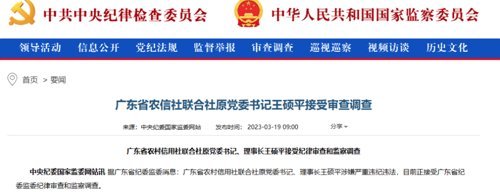 今年3月19日,中央纪委国家监委网站通报显示,广东省农村信用社联合社原党委书记、理事长王硕平涉嫌严重违纪违法,接受广东省纪委监委纪律审查和监察调查。