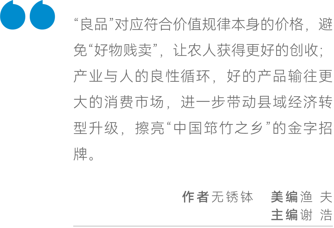 大关本地的优质原料产地通过标准化的种植与采摘体系,进一步提升产能与产值;“良品”对应符合价值规律本身的价格,避免“好物贱卖”,让农人获得更好的创收;产业与人的良性循环,好的产品输往更大的消费市场,进一步带动县域经济转型升级,擦亮“中国筇竹之乡”的金字招牌。