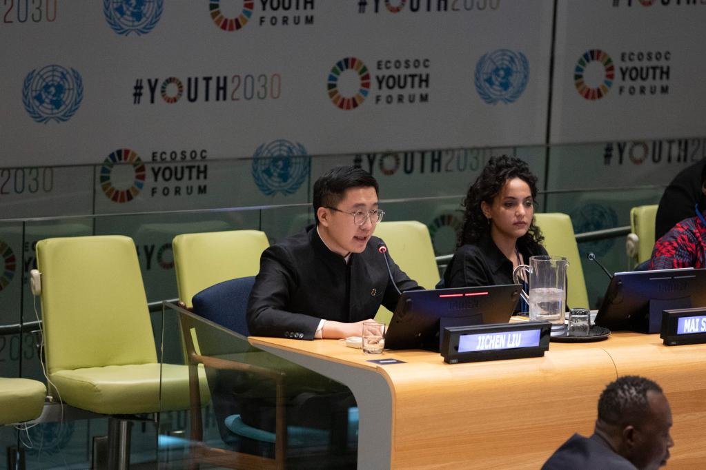 4月25日,在纽约联合国总部,中国青年代表柳济琛(左)在联合国经济及社会理事会青年论坛上发言。新华社记者 谢锷 摄