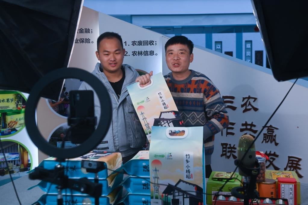 1月13日,在太湖源镇党群服务中心的直播间,青年创客在推荐自己种植的大米。新华社记者 徐昱 摄