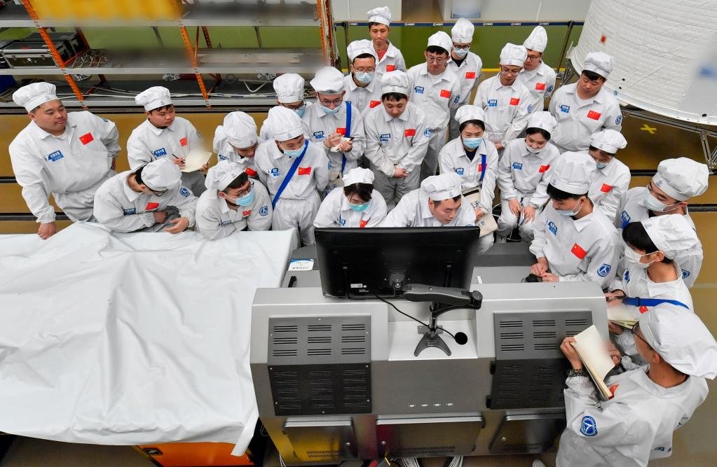 4月19日,在航天科技集团一院天津火箭公司总装测试车间,年轻的火箭装配人员聚在一起认真研讨。新华社记者 孙凡越 摄