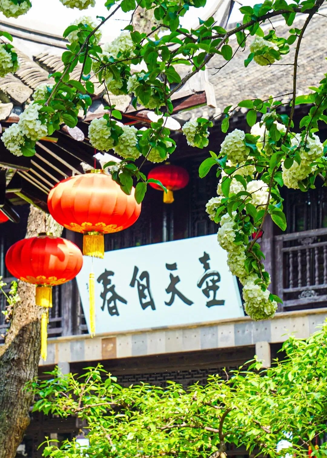 寺院犹如一座园林,翠郁的松柏,海棠刚谢,琼花又盛开,为寺院增添了不少春色。