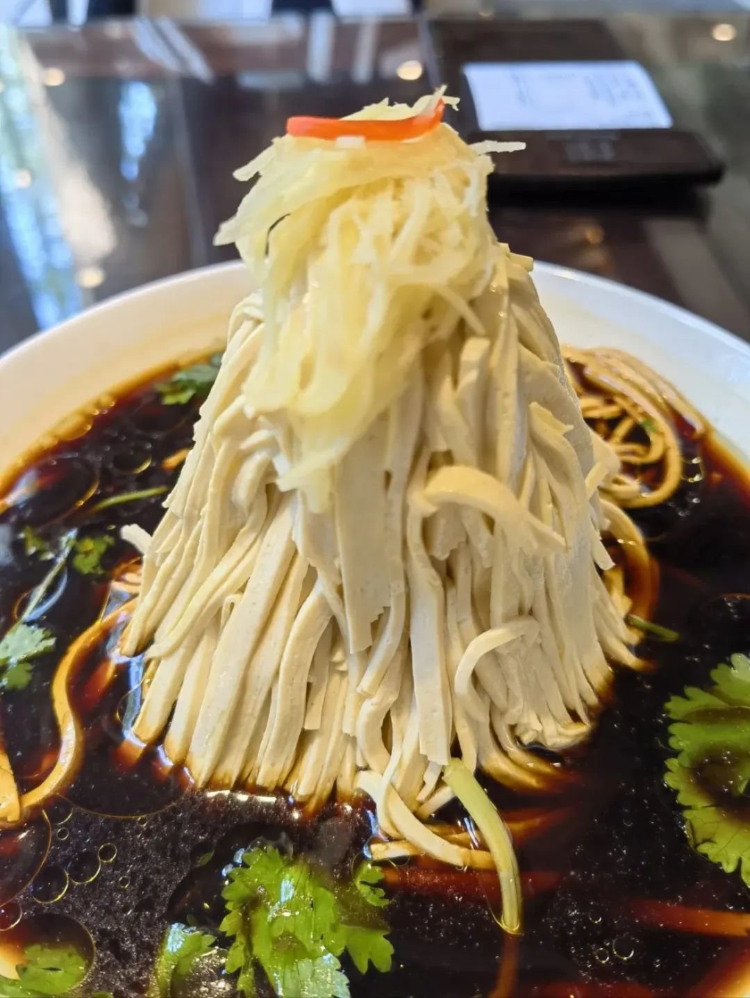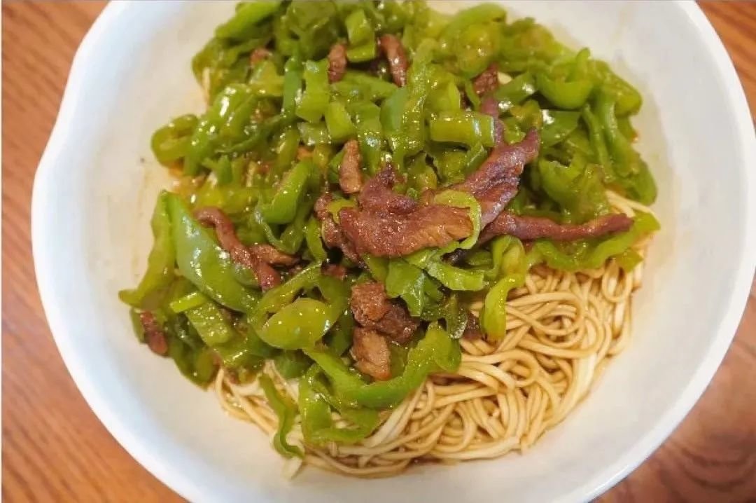 青椒肉丝盖面也值得尝一尝,上面铺满青椒肉丝浇头,青椒脆爽,肉丝鲜嫩,酱油香味十足。个人觉得青椒肉丝盖面的黄金搭档是腰花汤。