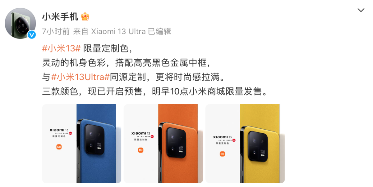 小米手机官方微博宣称,这三款配色与小米13 Ultra 同源定制,同样采用高亮黑色金属中框打造,搭配科技纳米皮材质,同样是拥有赤霞橙、银杏黄和星空蓝三款配色。