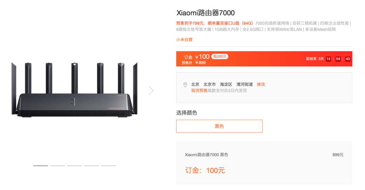 小米路由器 7000 的预售价为 899 元,现在已经开启预售,100 元订金可以抵 200 元,到手价仅为 799 元,感兴趣的朋友可以前往下单。