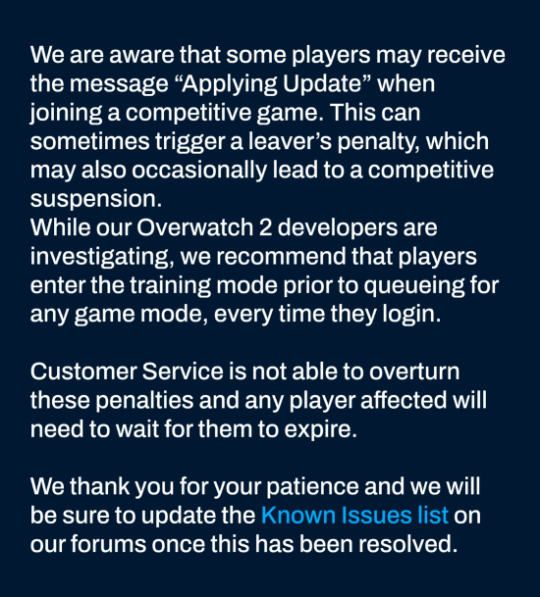 近期《守望先锋2》的第四赛季上线后,游戏匹配似乎出现了问题,很多玩家反馈称在加入比赛时会遇到“正在申请更新”的消息提醒,然后游戏就会断开竞技比赛的连接,随之而来的是被禁赛一整个赛季的可怕后果。