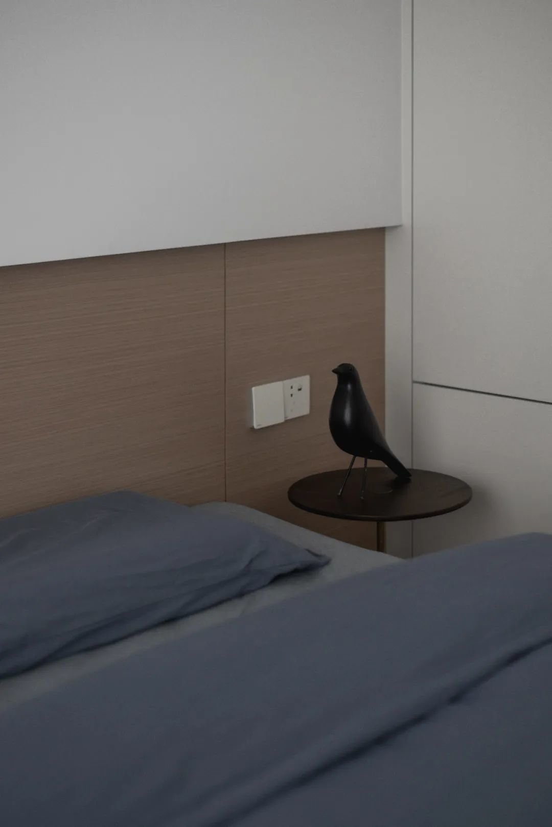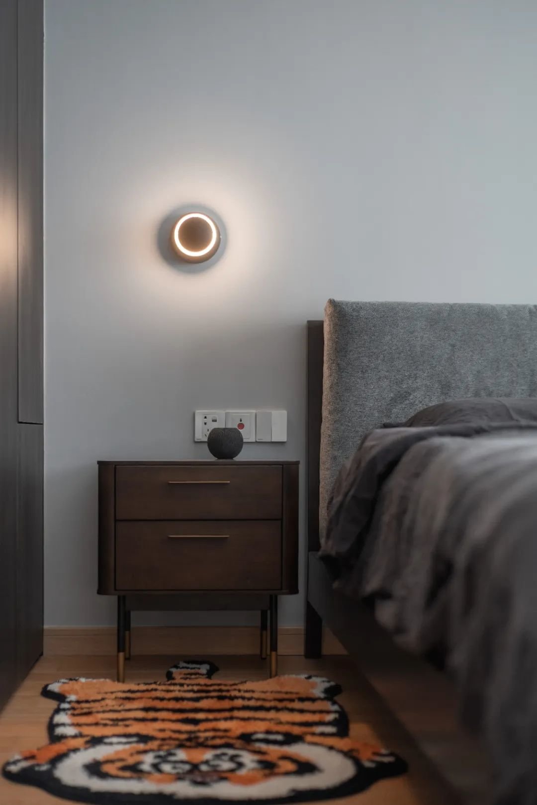 深色木饰面和灰色乳胶漆搭配,灰色调包容性强,沉静的色系更利于休息。