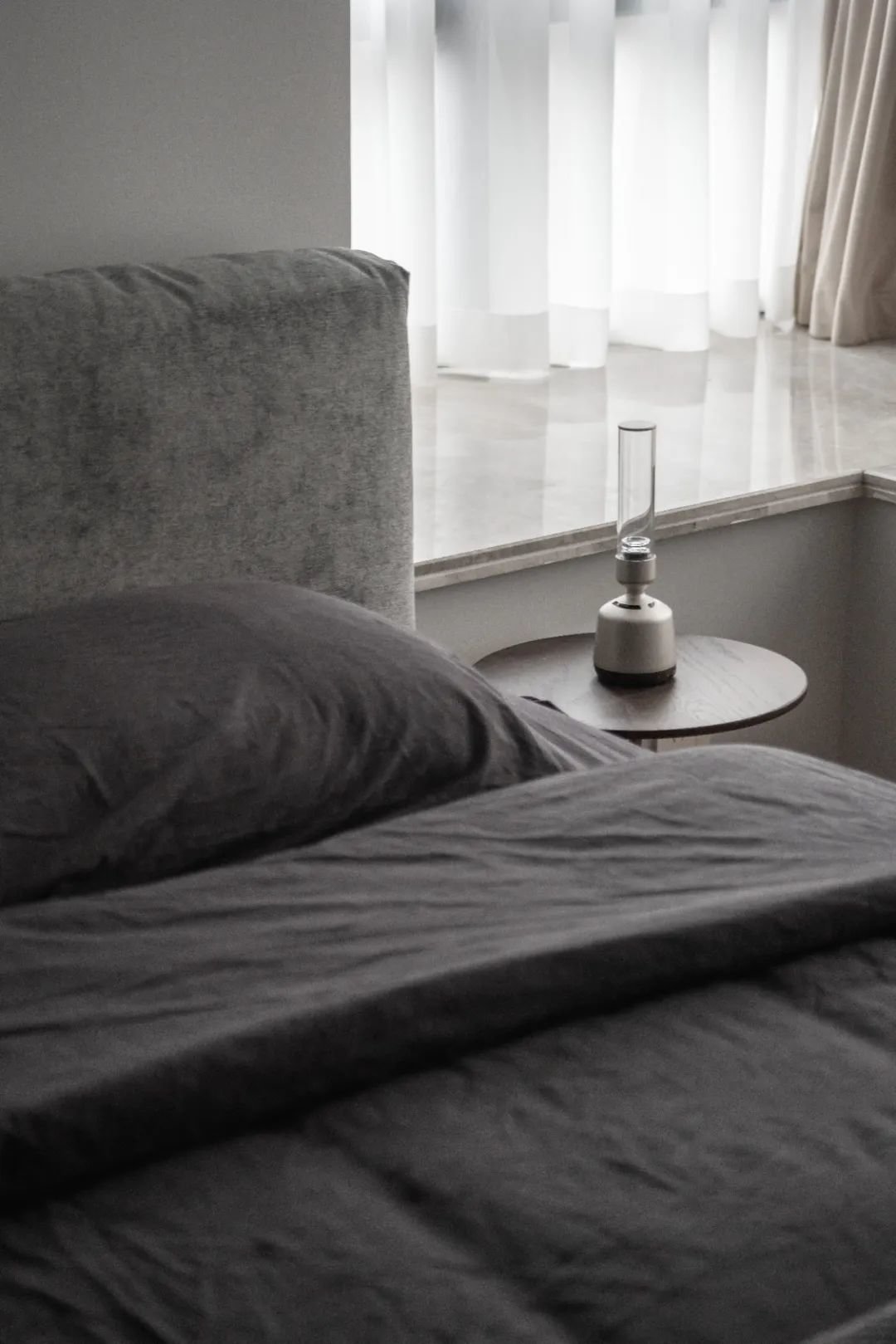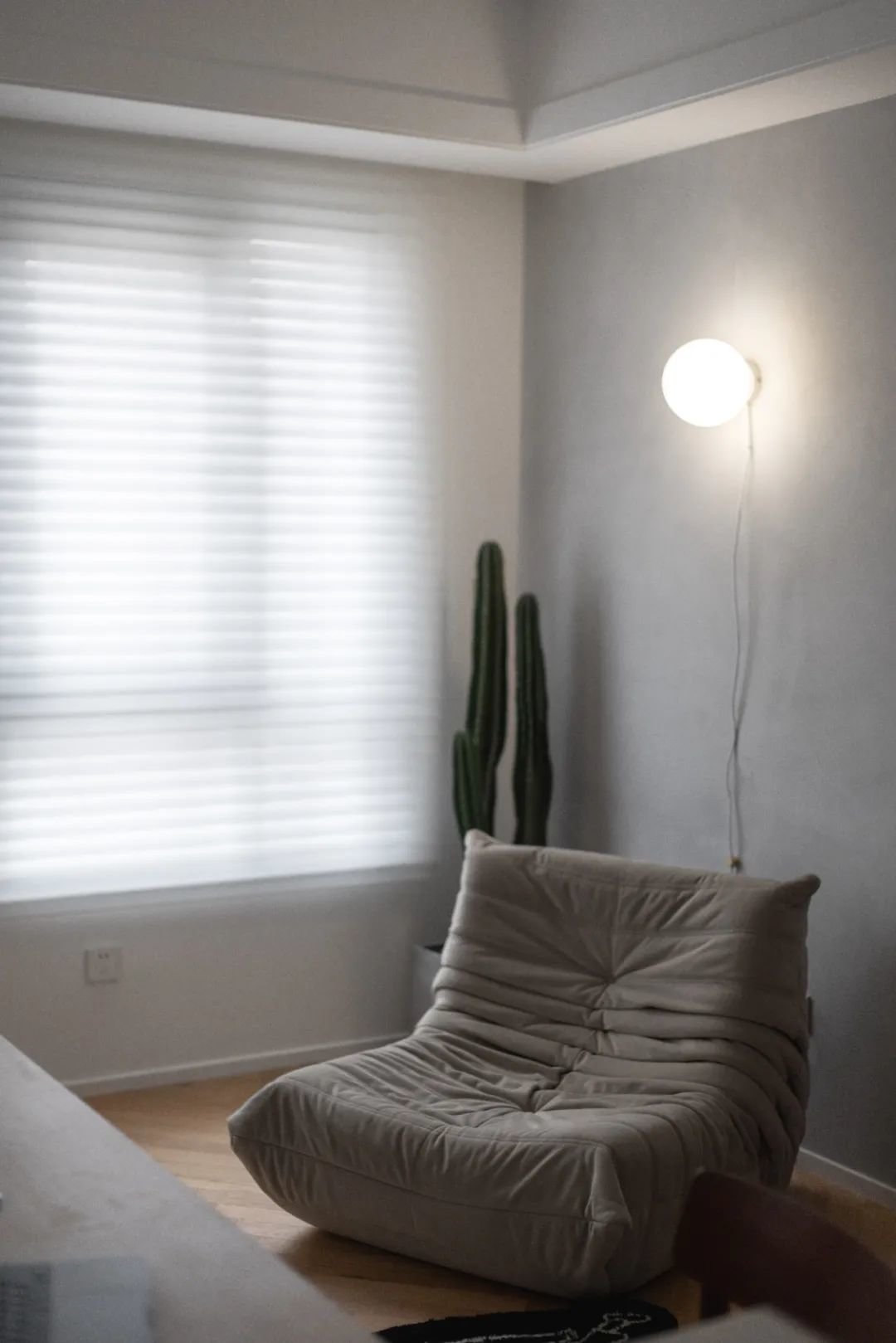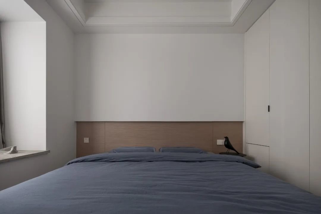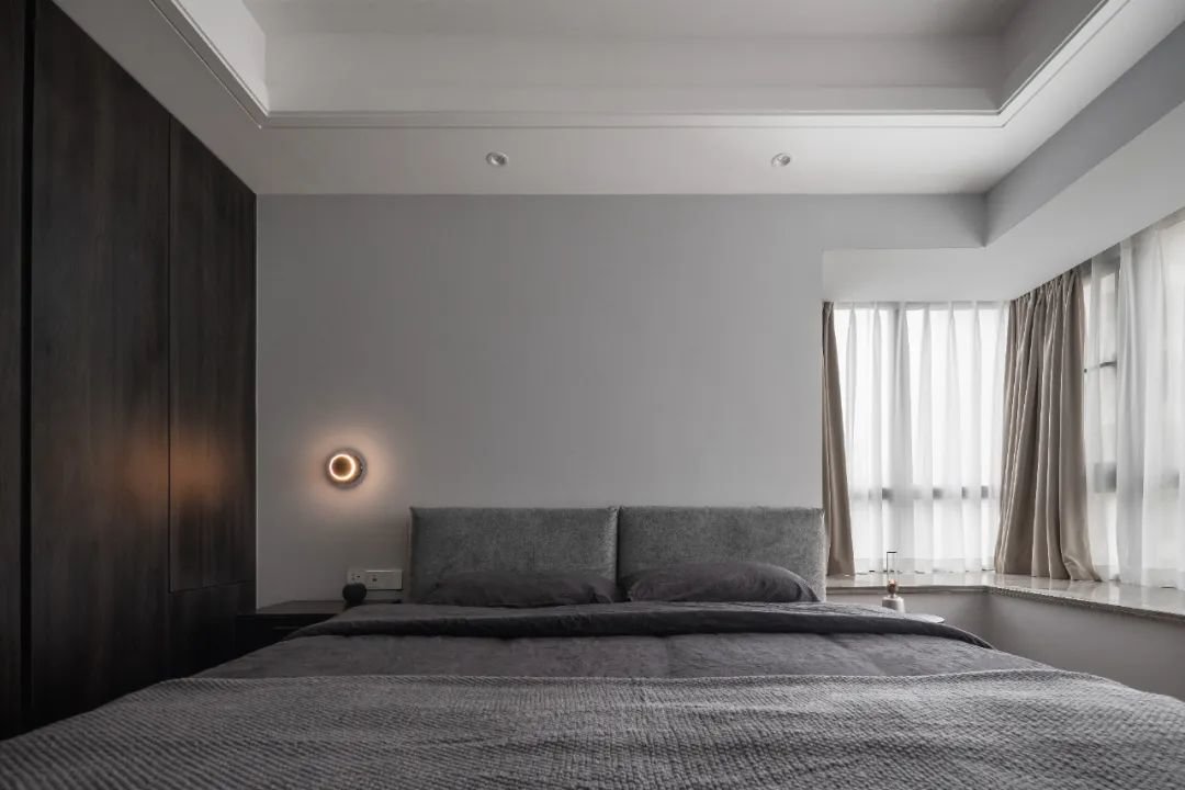 主卧墙面刷了灰色乳胶漆,营造静谧的睡眠环境。