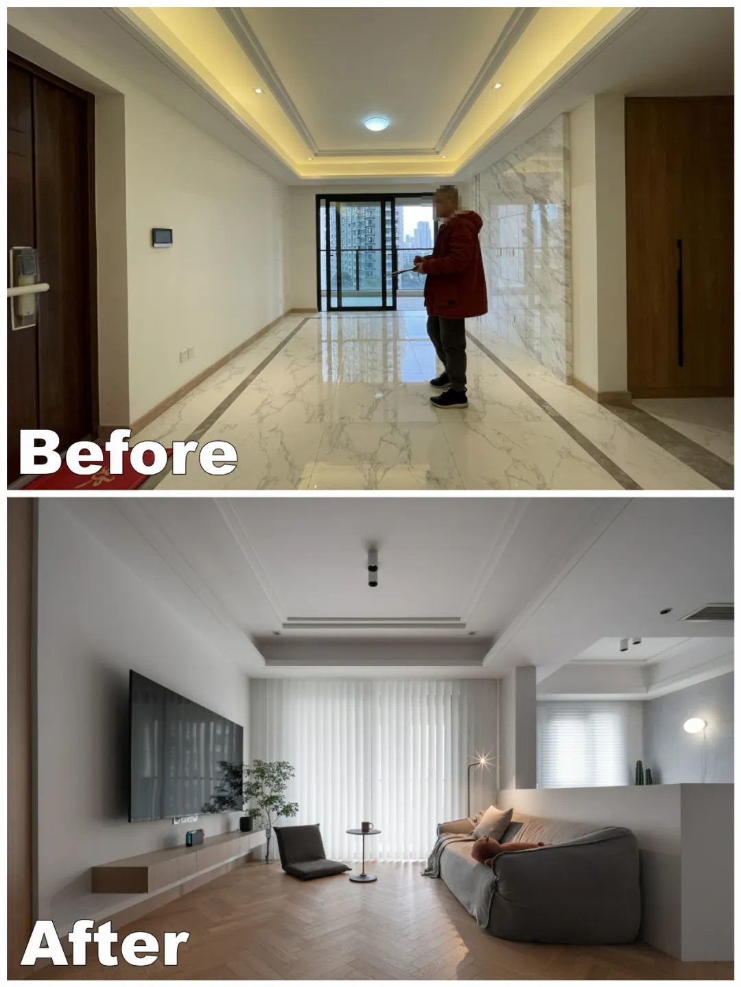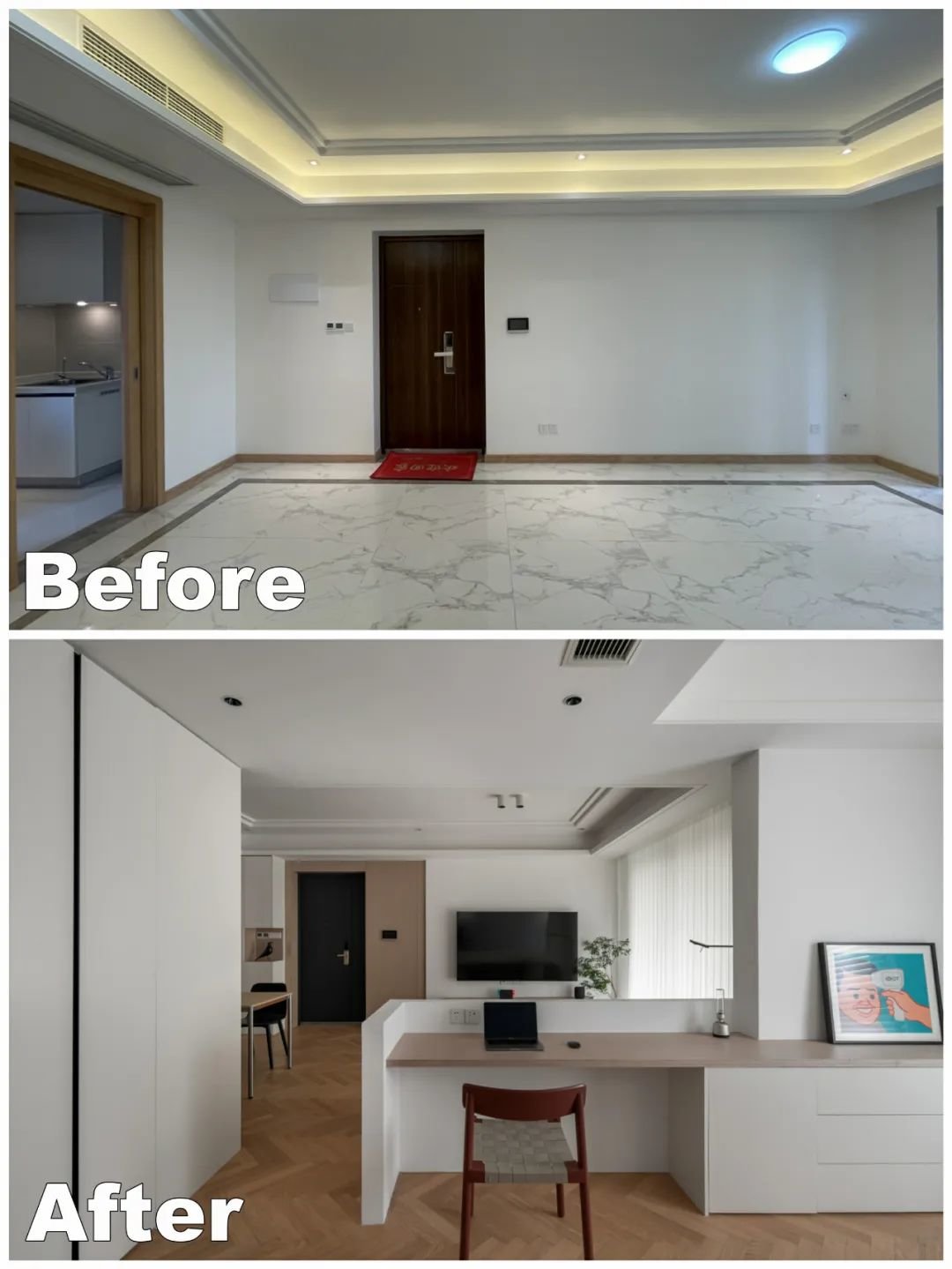 拆除原有地砖,重新找平后做人字铺木地板,拆除客厅及书房墙体后做矮墙增加书房书桌及沙发靠背。考虑到中央空调及预算,吊顶没有做改动,局部作了修补及增加灯具照明。