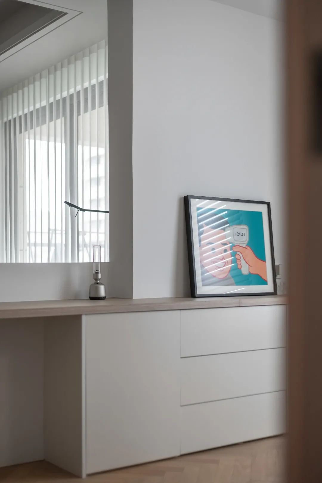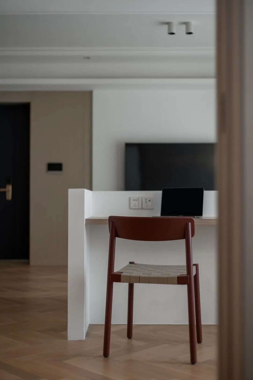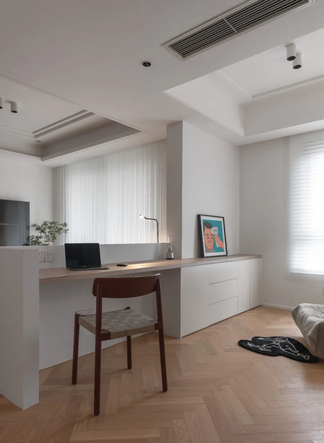 书桌右下方定制矮柜增加书房储物性。同时把弱电箱及网络设备放在矮柜内,让空间更整洁。