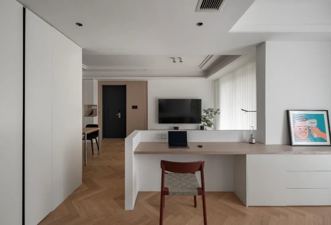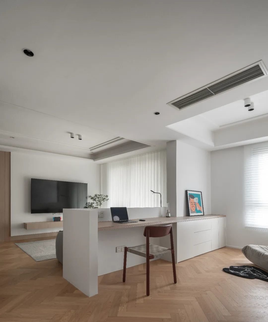 用矮墙分割书房及客厅区同时不遮挡视线,近3.5m的书桌满足在家办公的需求。