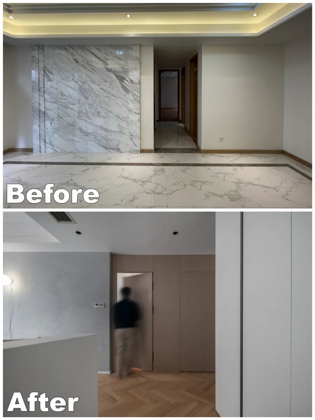 这套房子为精装修交付,局促的户型结构及风格无法满足屋主的居住需求,如何打破和重组空间的界限是本案的改造重点。